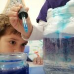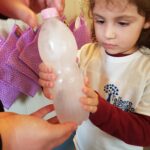L’evaporazione e la condensazione sono state analizzate nel concreto osservando oggetti e azioni concrete, come far bollire dell’acqua o toccare una bottiglia d’acqua ghiacciata: evaporando l’acqua si trasforma in vapore, mentre l’aria, a contatto con la bottiglia fredda, passa dallo stato aeriforme a quello liquido. Sono osservazioni come queste che permettono l’acquisizione di un concetto puramente astratto in maniera concreta; dal concreto all’astratto anche per comprendere il processo delle precipitazioni. Attraverso un esperimento i bambini hanno scoperto che la pioggia si forma in cielo e cade a terra perché è pesante. Creato un cielo coperto da una grande nuvola all’interno di un vasetto con dell’acqua e schiuma da barba, utilizzando un contagocce, sono state fatte cadere delle gocce d’acqua colorata: le gocce, essendo pesanti, oltrepassano la nuvola e cadono nell’acqua, lasciando una scia di colore ben visibile.