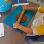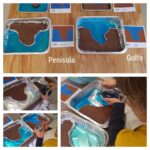 Una golosa attività ha favorito l’analisi del concetto di contrasto geografico: una base di pastafrolla al cacao (incisa per creare i contrasti di isola, lago, penisola e golfo) e acqua colorata per rappresentare il mare hanno permesso ai bambini di vivere un’esperienza sensoriale che li preparerà agli studi futuri.