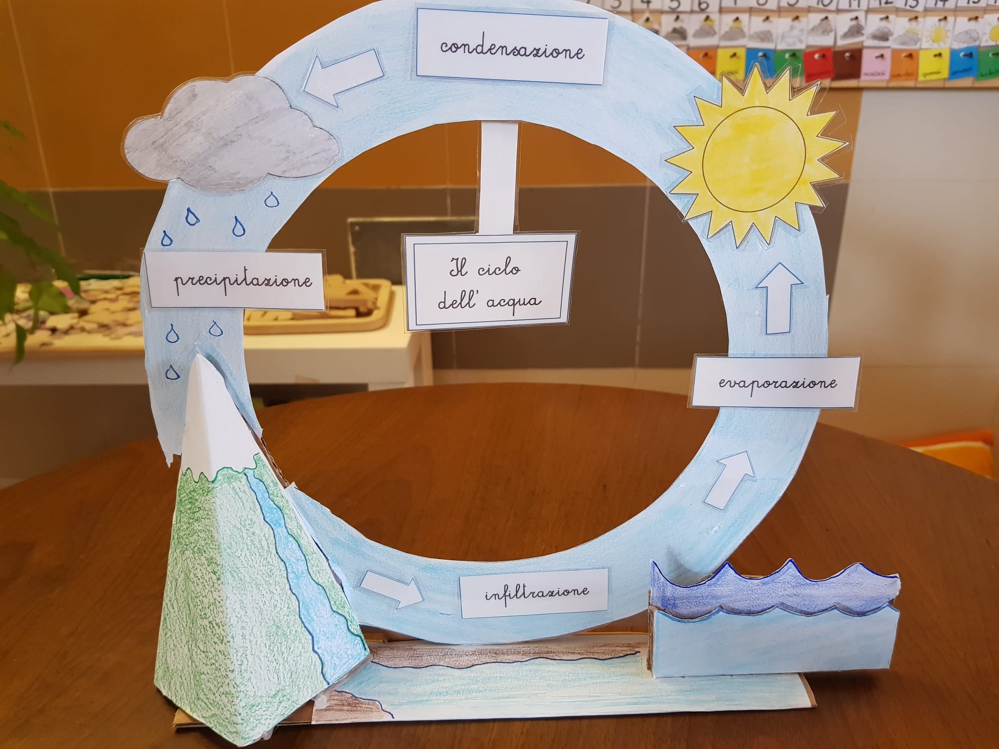 Attraverso il diagramma del ciclo dell’acqua e grazie alle illustrazioni di un bellissimo libro, i bambini hanno appreso le varie fasi degli stati dell’acqua: non c’è un inizio o una fine, le molecole d’acqua si muovono continuamente.
