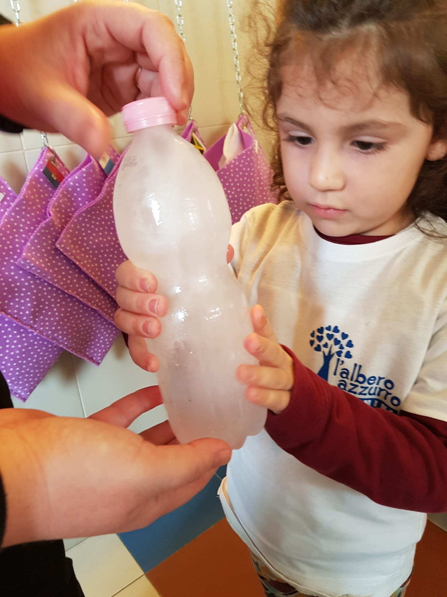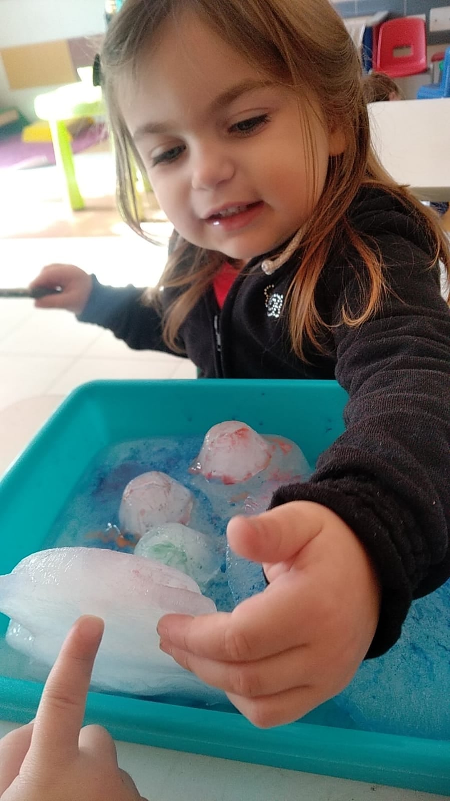 I più piccoli del nido hanno toccato con mano uno degli stati dell’acqua, ovvero la solidificazione in ghiaccio, contestualizzandolo in un habitat polare, creato e colorato interamente da loro: un’esperienza sensoriale a 360° che ha permesso loro di allenare la motricità del polso e la coordinazione oculo-manuale.