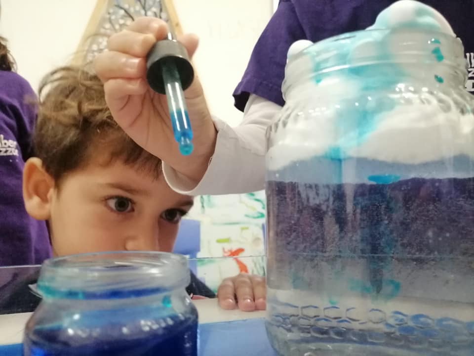 L’evaporazione e la condensazione sono state analizzate nel concreto osservando oggetti e azioni concrete, come far bollire dell’acqua o toccare una bottiglia d’acqua ghiacciata: evaporando l’acqua si trasforma in vapore, mentre l’aria, a contatto con la bottiglia fredda, passa dallo stato aeriforme a quello liquido. Sono osservazioni come queste che permettono l’acquisizione di un concetto puramente astratto in maniera concreta; dal concreto all’astratto anche per comprendere il processo delle precipitazioni. Attraverso un esperimento i bambini hanno scoperto che la pioggia si forma in cielo e cade a terra perché è pesante. Creato un cielo coperto da una grande nuvola all’interno di un vasetto con dell’acqua e schiuma da barba, utilizzando un contagocce, sono state fatte cadere delle gocce d’acqua colorata: le gocce, essendo pesanti, oltrepassano la nuvola e cadono nell’acqua, lasciando una scia di colore ben visibile.