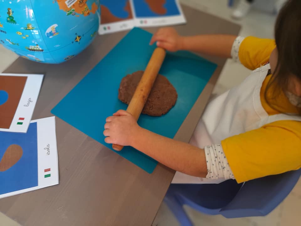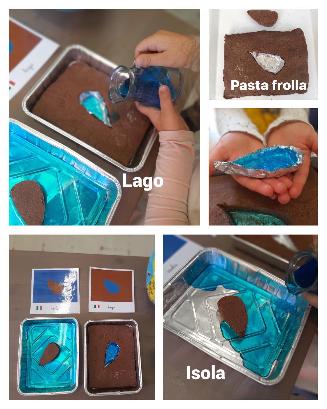 Una golosa attività ha favorito l’analisi del concetto di contrasto geografico: una base di pastafrolla al cacao (incisa per creare i contrasti di isola, lago, penisola e golfo) e acqua colorata per rappresentare il mare hanno permesso ai bambini di vivere un’esperienza sensoriale che li preparerà agli studi futuri.